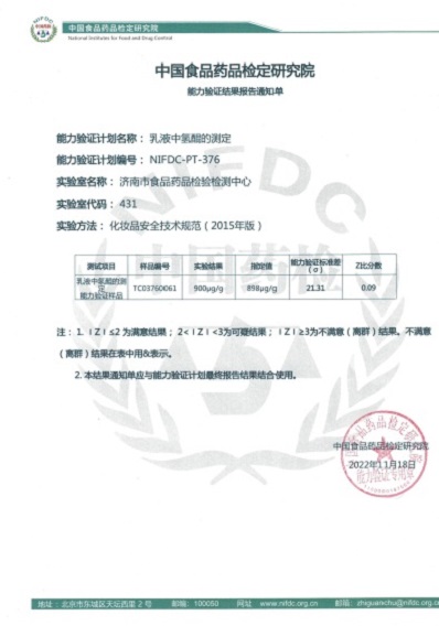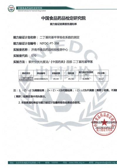 近日,市食品药品检验检测中心收到国家局、中国食品药品检定研究院、CNAS等发出的十项能力验证结果证书,包括HPLC法测定何首乌中二苯乙烯苷的含量、化妆品菌落总数计数、二丁基羟基甲苯吸收系数的测定等项目,均获得满意结果!