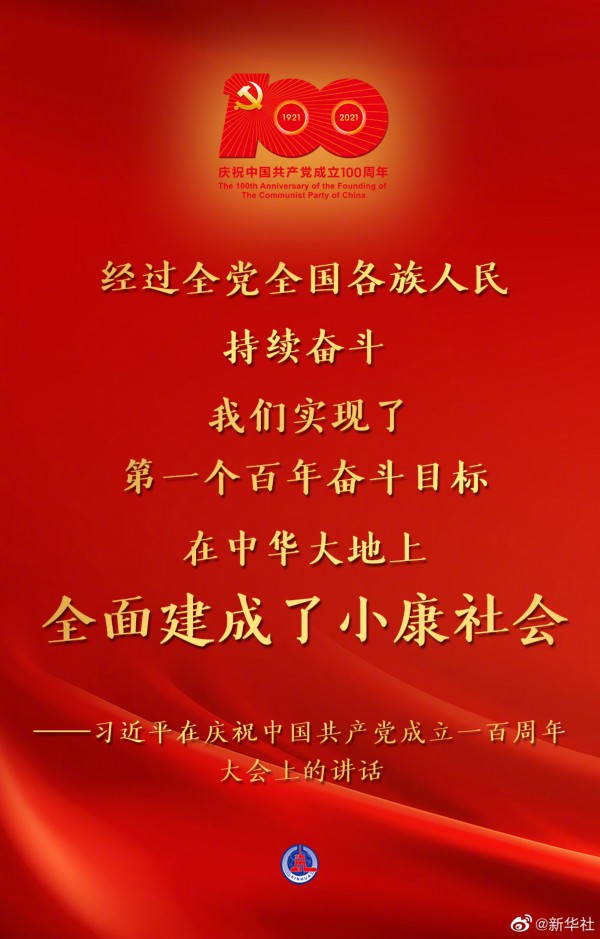 习近平代表党和人民庄严宣告,经过全党全国各族人民持续奋斗,我们实现了第一个百年奋斗目标,在中华大地上全面建成了小康社会,历史性地解决了绝对贫困问题,正在意气风发向着全面建成社会主义现代化强国的第二个百年奋斗目标迈进。这是中华民族的伟大光荣!这是中国人民的伟大光荣!这是中国共产党的伟大光荣!