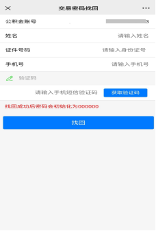 ③点击“获取验证码”,收到公积金中心发送的验证码后将它填写到验证码一栏里。点击『找回』,页面显示“找回成功”即可。(找回成功后密码会初始化为000000)