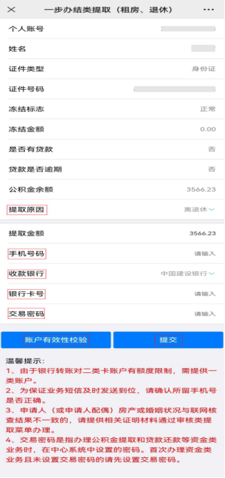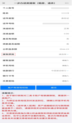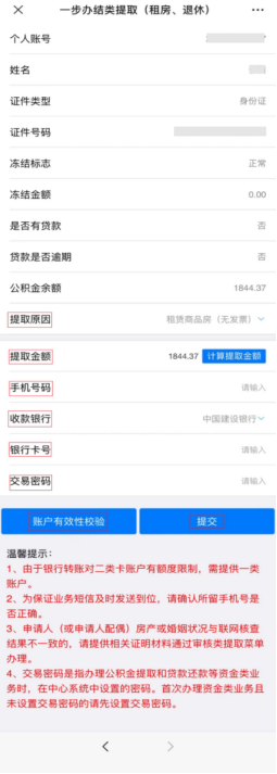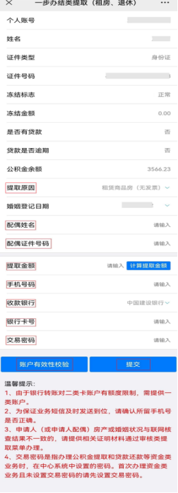 ③返显个人信息后提取原因选择『租赁商品房(无发票)』,已婚的还需填写配偶姓名和身份证号。然后输入提取金额(也可点击计算提取金额)、手机号码,选择收款银行,录入银行卡号、交易密码,点击账户有效性校验,提示账户有效即可。最后点击『提交』。