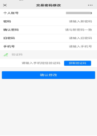 ②选择菜单中『交易密码修改』,输入新密码、旧密码、手机号。