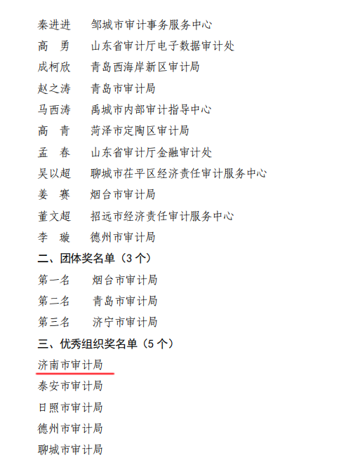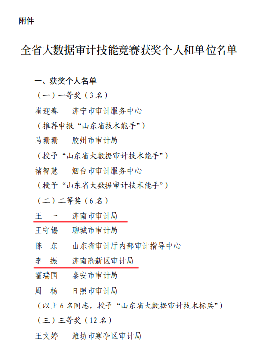 近日,全省大数据审计技能竞赛决赛圆满结束,市审计局王一和高新区审计局李振均荣获个人成绩二等奖,并被授予“山东省大数据审计技术标兵”称号。市审计局获得优秀组织奖。