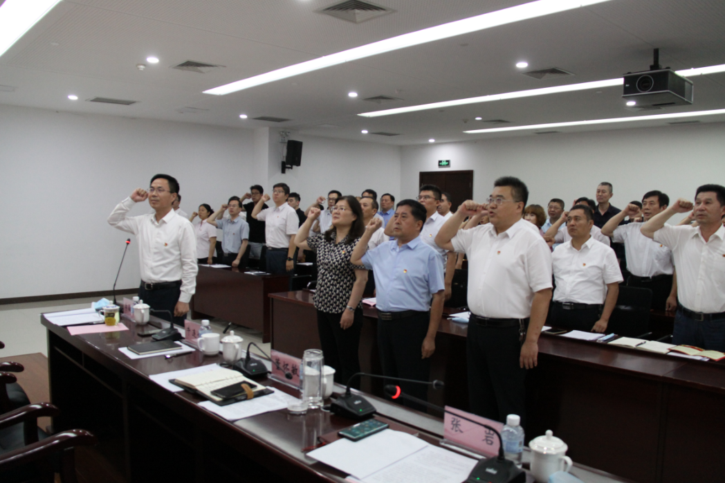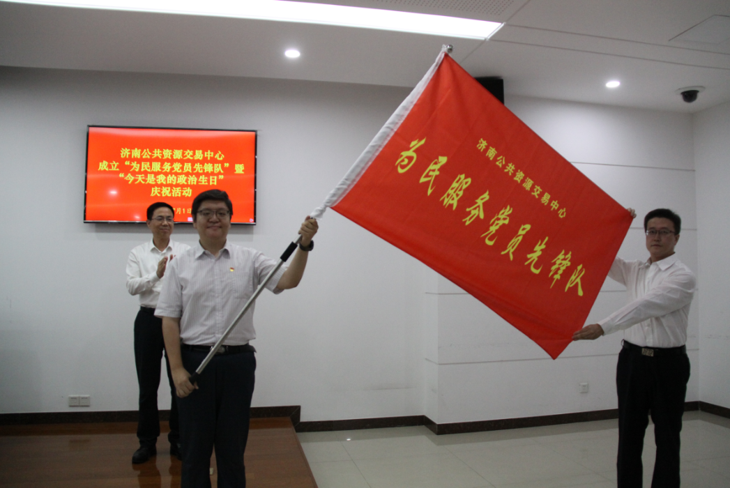 牛连平副主任宣读《关于成立“为民服务党员先锋队”的决定》;中心党组成员为“七一”前后入党的同志集体过“政治生日”,发放“政治生日”贺卡;中心党组书记、主任董怀敏为“为民服务党员先锋队”授旗,并带领全体党员面对党旗重温入党誓词。