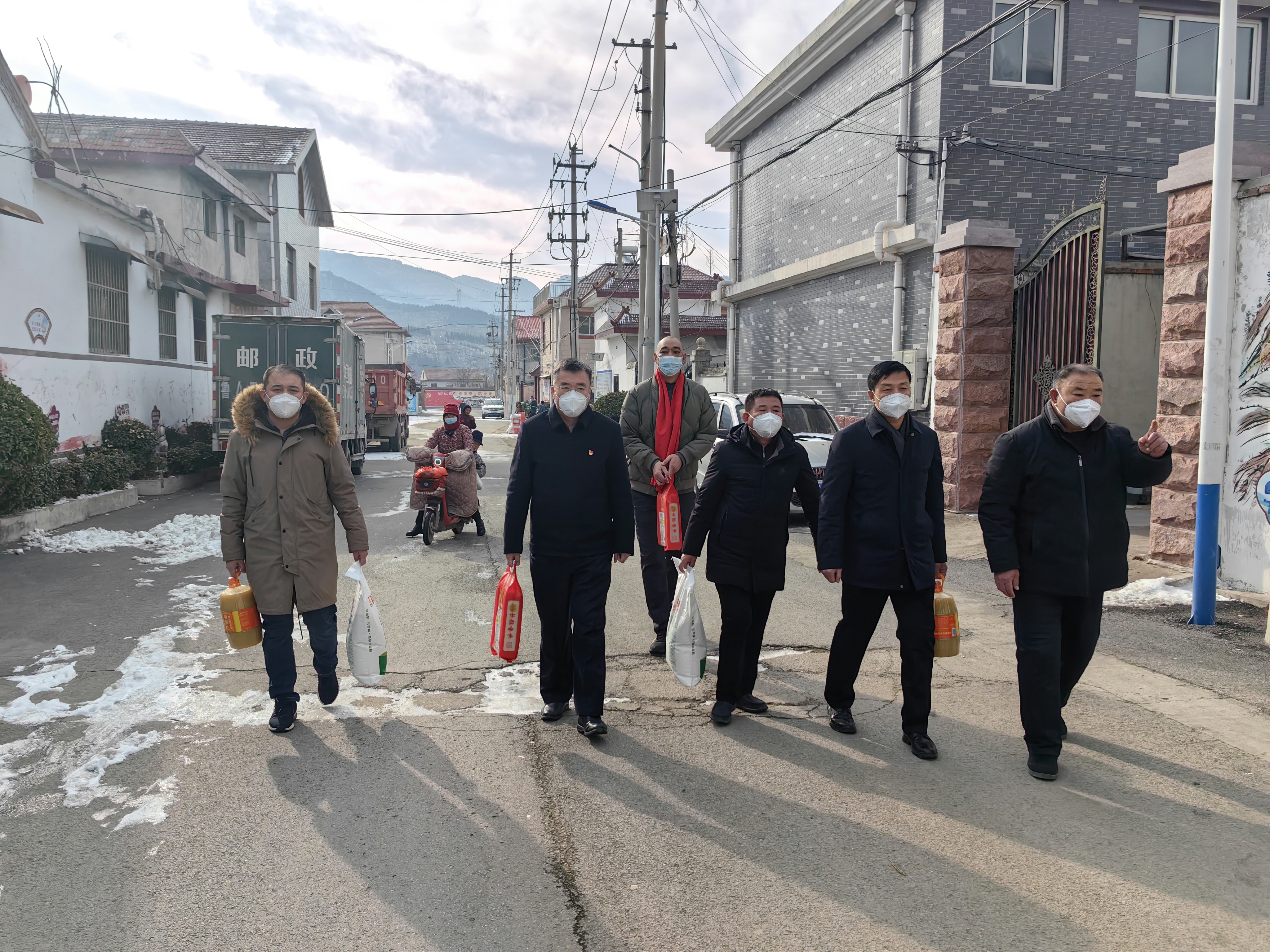 最后,结算中心领导一行分别与村领导一起前往村中的建档立卡贫困家庭走访慰问,为他们送去米、面、油等生活用品,叮嘱他们要注意疫情防护,照顾好自己的生活,有困难第一时间向村委和驻村第一书记反映解决,并提前为他们送上新春的祝福,真真切切将党组织的温暖送到了驻村干部、人民群众身边。