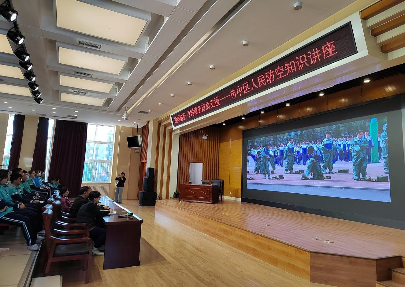 “防空警报是什么?”“人防工程和地下室有哪些区别?”“鸣走藏消具体指的是什么?”课堂上,人防中心宣传员以讲座形式通过图文并茂、播放视频和随机提问的方式,在一问一答间让在场学生们了解人防知识,进一步增强了学生的国防观念和忧患意识,提升了学生们的自救互救能力。
