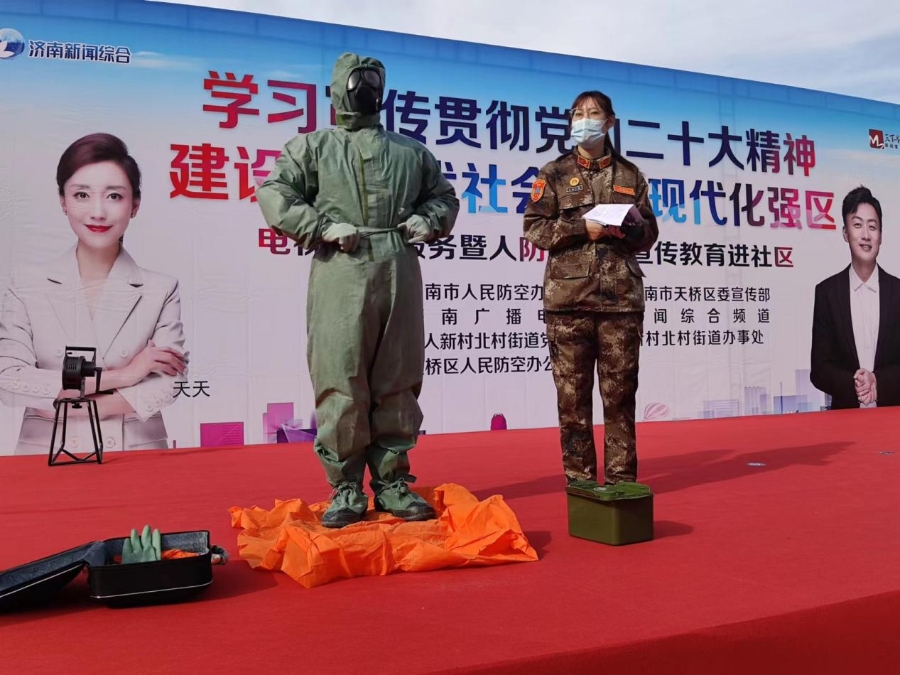 “化学武器是通过呼吸道和皮肤进入人体,对人体产生危害。防毒面具和防化服可以有效阻隔有害气体对人体的侵害,防止中毒时间的发生。而连体防化服可以更好的保护我们,将身体与毒气完全隔离,不留一点缝隙。”工作人员详细讲解展示了防毒面具和连体防化服的正确穿戴方法和使用注意事项。