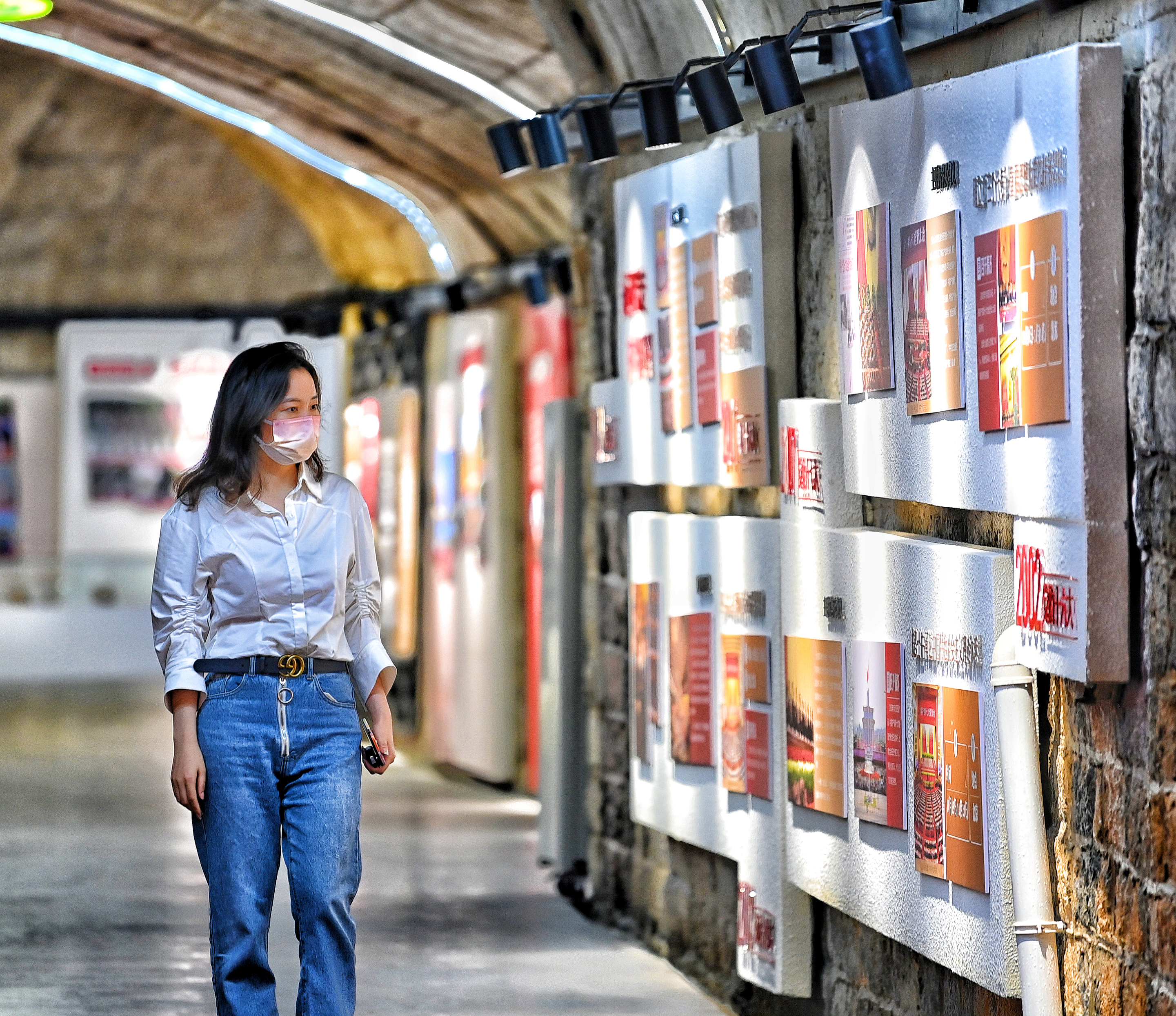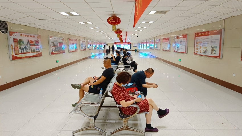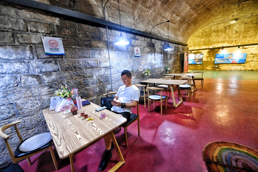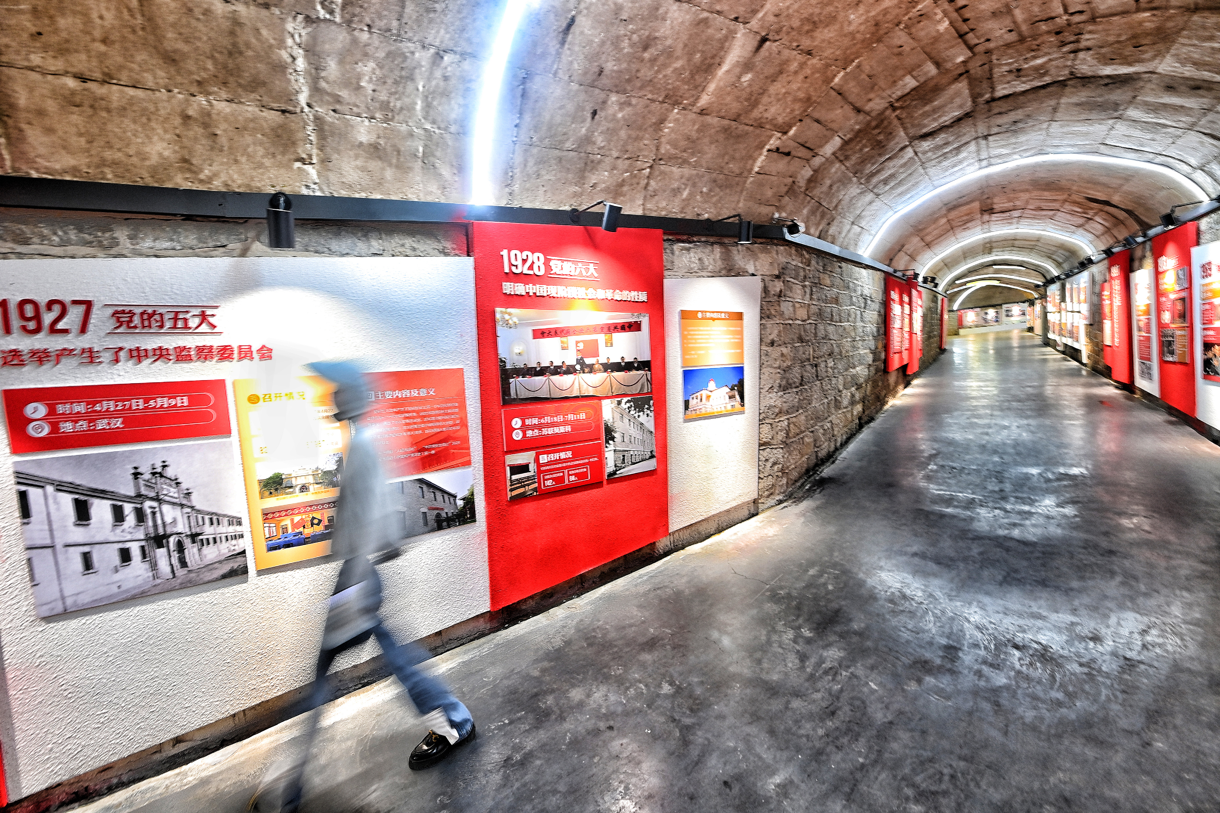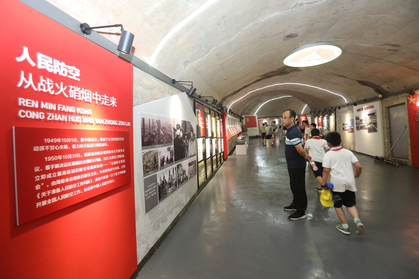 一进入洞内,首先映入眼帘的就是党史展陈区,各色展板在灯光的照射下格外鲜艳,介绍了从党的一大到十九大,中国共产党波澜壮阔的光辉历程。展陈柜内,几十件人防实物,记录了人民防空从无到有、成长壮大的发展史。2000米长的长廊,开辟了展示陈列、运动健身、书报阅览、红影播放等功能区,提供免费的饮水。在此志愿服务的市人防安全应急救援中心综合部游仪介绍,每天上午九点多,群众就陆陆续续来到了,有专门前来乘凉休闲的,也有不少爬山的市民,进来歇歇脚,喝点水,每天都有好几百人。周末和节假日,不少家长带着孩子来接受红色教育,学习人防知识,观看红色电影。