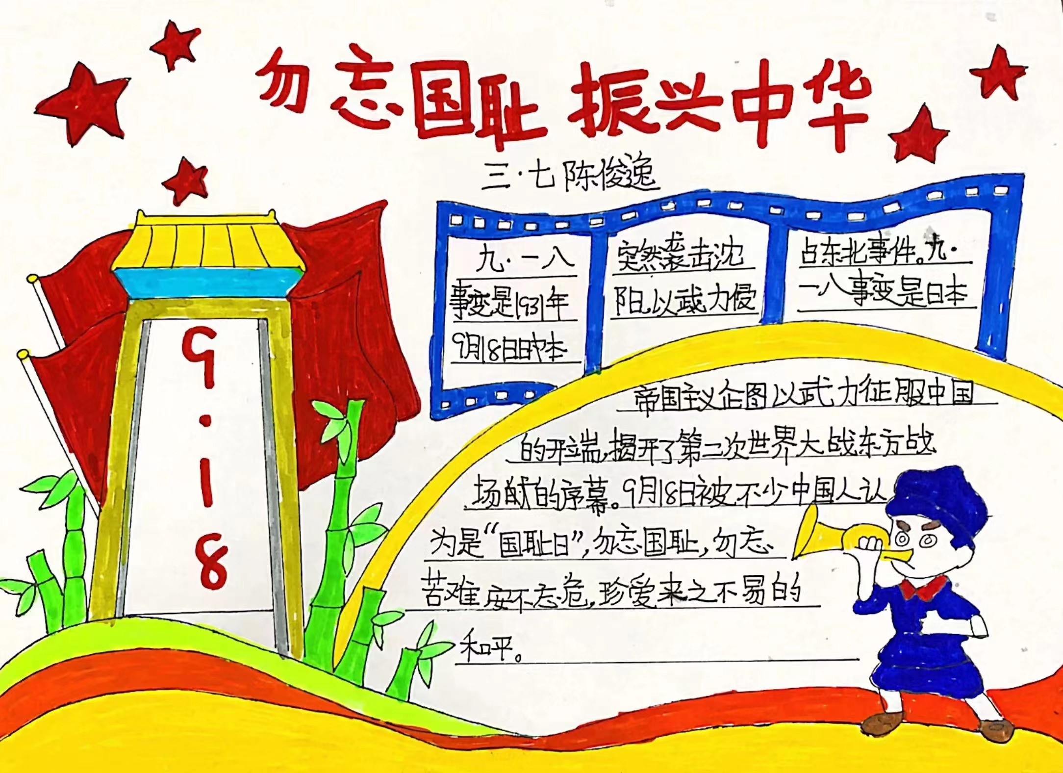 九一八事变,又称奉天事变、柳条湖事件。是1931年9月18日夜日本在中国东北蓄意制造并发动的一场侵华战争,是日本帝国主义全面侵华的开端。今年是纪念“九一八”事变91周年,莱芜区汶源学校积极开展“勿忘国耻,不负韶华”主题活动,激发当代少先队员昂扬的斗志,不负韶华,奋发有为!