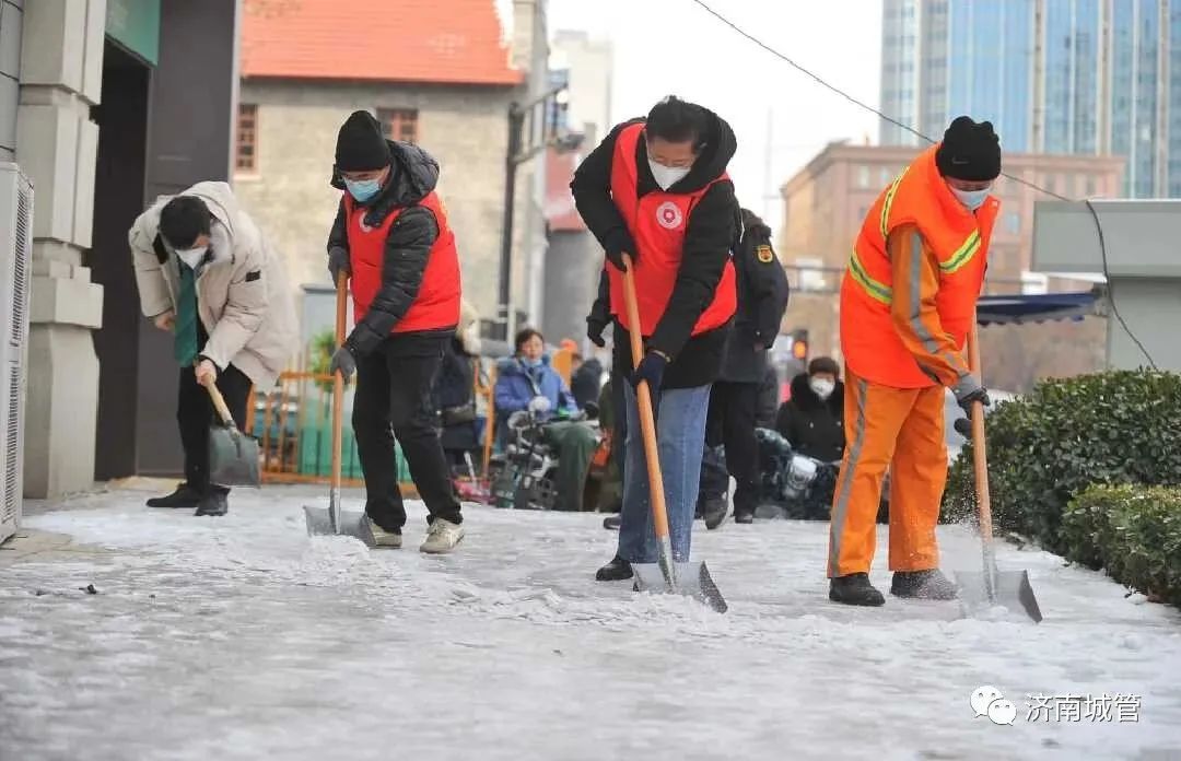 在洪楼广场东侧的人行道上,房泽秋志愿服务队的志愿者们主动担起最重的活儿,队员们争相努力清理着地上的积雪。“部分商铺门前和市民经常行走的人行道上,还有没清理干净的积雪,被踩实后过往市民很容易在这里滑倒,必须拿铁锨一点点地铲掉。”