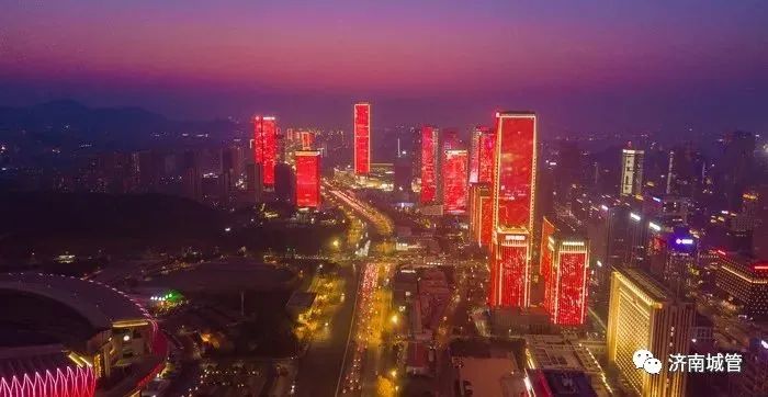 从空中眺望别有一番风景,趵突泉、泉城广场、西客站、奥体中心披上彩衣,铺展出一幅火树银花不夜天的现代化都市夜景。华灯下的济南,人流如织、车流如梭,处处洋溢着欢乐的节日气氛,处处展现出城市活力与魅力。