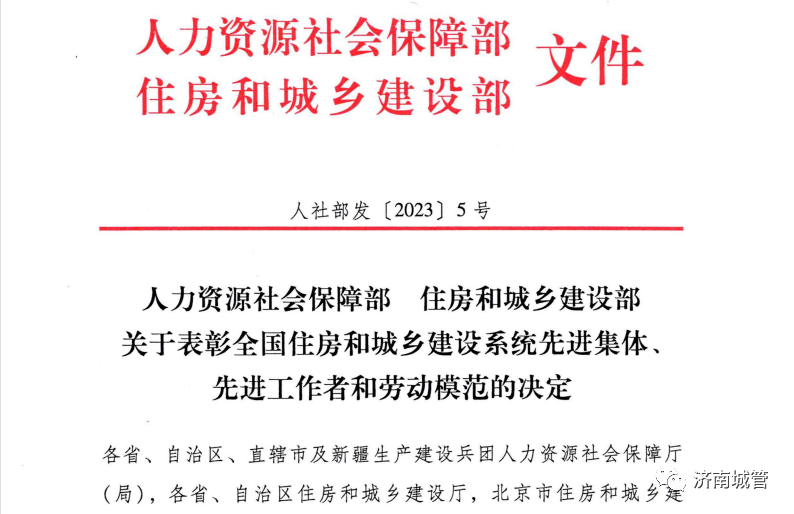 在深入学习党的二十大报告过程中,大家感到精神振奋、备受鼓舞,大家一致表示,在今后的工作中,要紧紧抓住人民最关心最直接最现实的利益问题,坚持尽力而为、量力而行,深入群众、深入基层,采取更多惠民生、暖民心举措,着力解决好人民群众急难愁盼问题,着力提升干净整洁的城市环境和形象,提高市民的生活品质,为加快建设新时代魅力济南贡献城管力量。 城市管理彰显着一个城市的文明程度、发展水平和综合实力,既关系到“面子”,也关系到“里子”。回首过去的一年,济南城管用幸福针脚“绣出”新时代新济南,让“听得见泉水叮咚,看得见一城山色”是宜居济南的最美注脚。 在精考细核中,济南城管交上了一份令人满意的答卷。又是一年收获季,又是一年收获时,这个春天,济南城管人用辛勤的汗水、敬业的情怀,谱写了专属于他们的迎春序曲。 近日,济南市城管系统喜讯连连,人力资源社会保障部、住房和城乡建设部联合发布《关于表彰全国住房和城乡建设系统先进集体、先进工作者和劳动模范的决定》。济南市生活废弃物处理中心主任宫本水被授予全国住房和城乡建设系统先进工作者称号、济南市城肥清运管理二处一线清疏工俞耀泽被授予全国住房和城乡建设系统劳动模范称号。