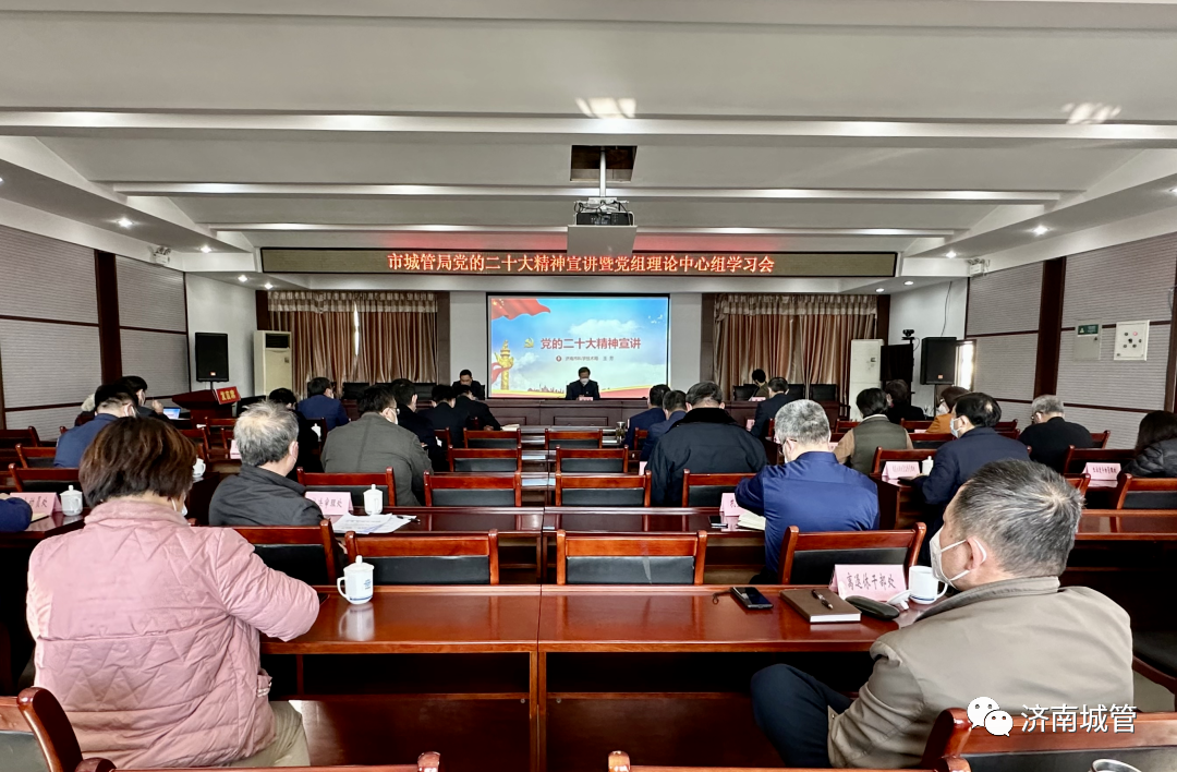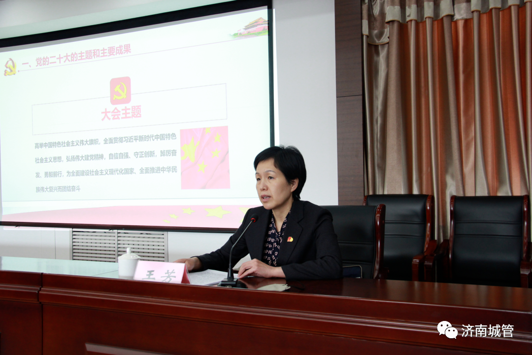 为推动全区各级党组织和广大党员认真学习、深刻领会党的二十大精神、切实把思想和行动统一到党的二十大精神上来。1月30日,济南市城管局举行学习贯彻党的二十大精神宣讲暨党组理论学习中心组专题报告会,邀请学习贯彻党的二十大精神市直机关宣讲团成员、市科技局党组成员、副局长王芳作宣讲报告。党组副书记、副局长何继文主持会议,党组书记、局长许宗生出席,党组班子成员、市管干部,机关各处室、直属各单位主要负责同志参加报告会。