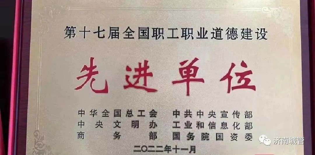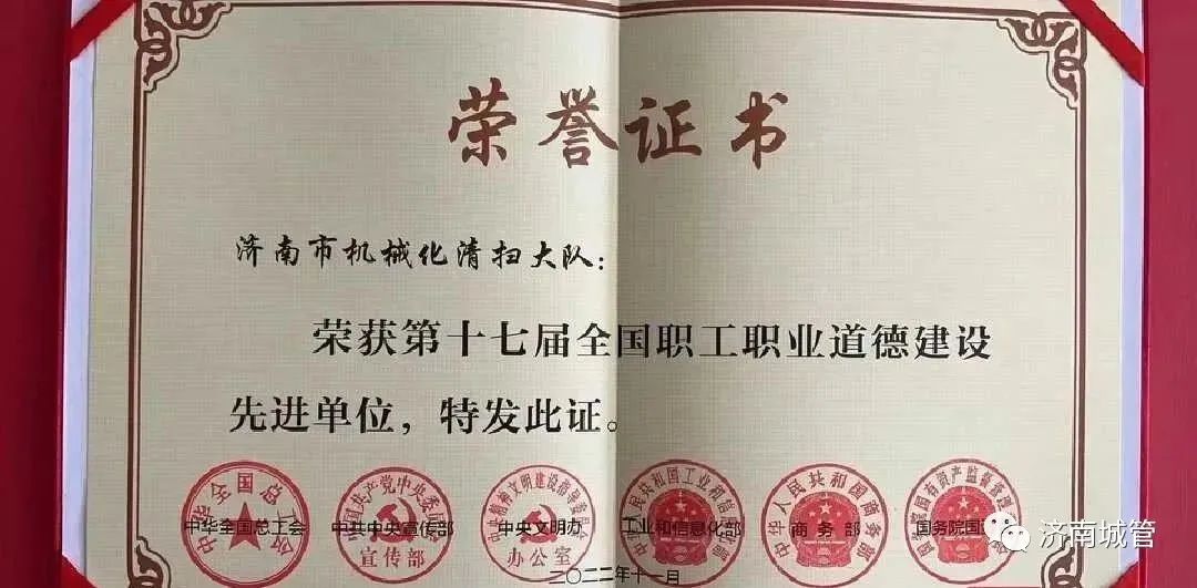 近日,第十七届全国职工职业道德建设评选结果揭晓,共有20个单位、20名个人被授予“全国职工职业道德建设标兵单位(个人)”称号,50个单位、50名个人被授予“全国职工职业道德建设先进单位(个人)”称号。其中,济南市机械化清扫大队榜上有名,荣膺“全国职工职业道德建设先进单位”称号。