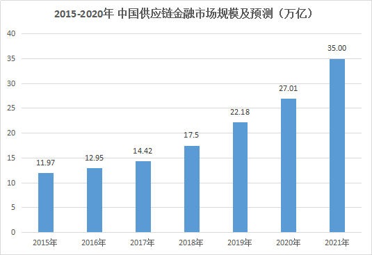 从发展进程看:我国供应链金融业务最早产生于深圳发展银行,1999年,深圳发展银行在华南地区以“票据贴现”业务最先介入供应链金融领域。近年来,国内应收账款和存货等资产的高速增长为我国供应链金融的迅速发展奠定了基础。根据国家统计局的数据,我国2006~2015年工业企业应收账款净额年均复合增长率为15.6%,从2006年的31692.21亿元增长到2015年的117246.31亿元,增长2.7倍;我国2006~2015年工业企业存货复合增长率为12.0%,2015年达到102804亿元,相比2006年的36999.26亿元,十年里增长了1.8倍。据某研究机构统计数据显示,2015年中国供应链金融市场规模达到14.42万亿元,2020年中国供应链金融市场规模将达到27.01万亿元,整体增幅87.31%,市场发展空间巨大。随着数字技术的深度应用,不断渗透到金融市场,未来供应链金融业务将有望爆发,预计2021年有望突破35万亿。