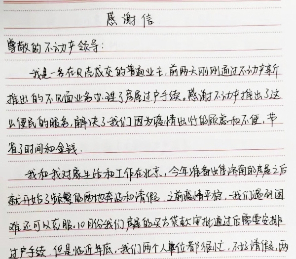 “尊敬的不动产登记中心领导,我是一名在贝壳交易中心成交的普通业主,前两天刚刚通过不动产新推出的‘不见面业务’办理了房屋过户手续。感谢不动产推出了这么便民的服务,解决了我们因为疫情出行的顾虑和不便,节省了时间和金钱……”11月28日,山东省济南市自然资源和规划局不动产登记中心收到一封来自北京的感谢信,密密麻麻的文字流露出感动和认可。这封信背后的故事,还要从一个多月前开始说起。