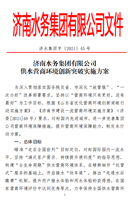 (图片说明:济南水务集团有限公司供水营商环境创新突破实施方案首页和内容页,详细内容见附件)