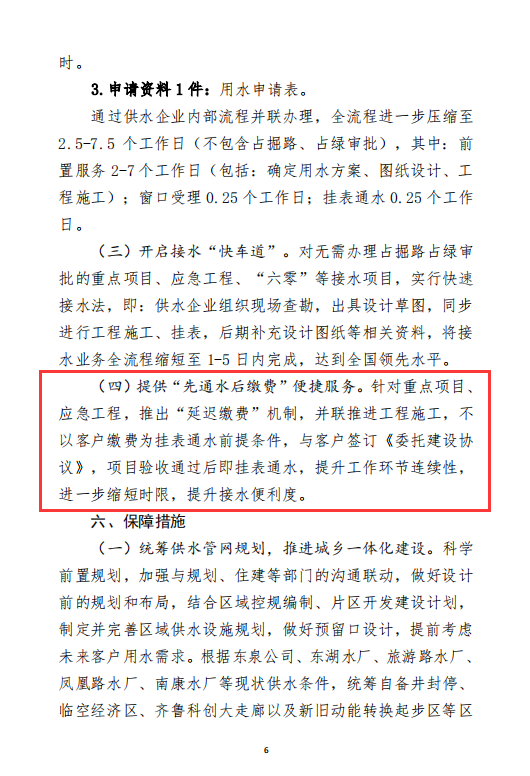 针对重点项目、应急工程等紧急特殊情况,2021年济南市“获得用水”积极探索,创新推出“延迟缴费”机制,并联推进工程施工,与客户签订《委托建设协议》,项目验收通过即开栓通水,不以客户缴费作为开栓通水的前提条件,优先让紧急客户先用上水,再缴纳工程费用。“先通水再缴费”服务不仅打通了服务“堵点”,也补上了服务“断点”,保证了工作环节连续性,进一步缩短接水时限,提升了接水便利度。
