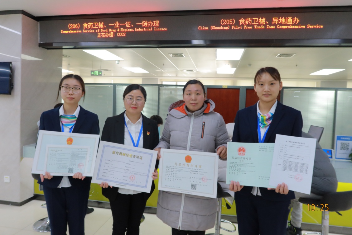 “这是变更好的食品经营许可证、药品经营许可证、医疗器械经营许可证、二类医疗器械备案凭证,请您收好!”在济南高新区政务服务中心“一链办理”窗口,工作人员将带着温度的多张许可证一并送到漱玉平民大药房连锁股份有限公司业务经办人郎女士手中。郎女士高兴的说:“现在办事真是越来越方便了,我们只填了一套表,在这一个窗口就办完了这么多业务,为你们的高效服务点赞!”