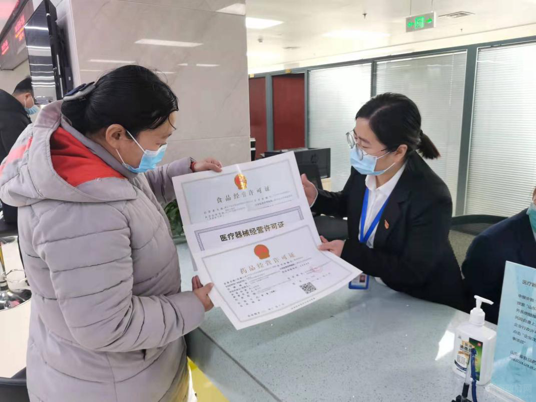“这是变更好的食品经营许可证、药品经营许可证、医疗器械经营许可证、二类医疗器械备案凭证,请您收好!”在济南高新区政务服务中心“一链办理”窗口,工作人员将带着温度的多张许可证一并送到漱玉平民大药房连锁股份有限公司业务经办人郎女士手中。郎女士高兴的说:“现在办事真是越来越方便了,我们只填了一套表,在这一个窗口就办完了这么多业务,为你们的高效服务点赞!”