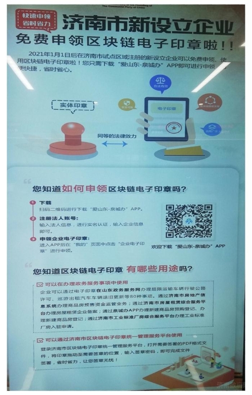 自2021年1月1日起,凡在试点区域登记机关登记且完成实体印章备案的企业,可使用手机下载、登录“爱山东泉城办”APP,经过企业法定代表人身份认证后,进入“电子印章”模块即可领取法定名称章、财务专用章、合同专用章、法定代表人名章等四枚印章。试点工作中免费发放的企业电子印章,参照实物印章备案管理,电子印模与在公安部门备案的实体印章“同模同轨”,与实体印章具有同等法律效力。电子印章基于区块链技术进行加密验真,防伪性能更加强大,自完成备案之日起免除3年服务费。