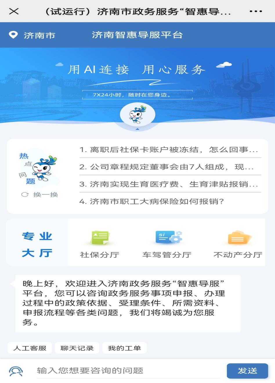 为方便企业群众实时在线问询办事难题,济南市政务服务“智惠导服”体系充分依托移动互联网的流量优势,在微信客户端、济南政务服务“一网通办”总门户、“爱山东·泉城办”APP、百度小程序等多平台,开放“智惠导服”用户入口。同时,进一步打造“智惠导服”平台矩阵,在市级、区县各政务服务公众号布设“智惠导服”专栏,实现市级、区县、街镇上下联动、互联互通。