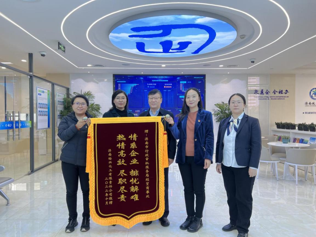10月20日,济南裕兴化工有限责任公司相关负责人为市行政审批服务局经贸商事处送上了一面题有“情系企业、排忧解难、热情高效、尽职尽职”的锦旗,对审批工作人员为企业排忧解难、热情高效服务表示感谢。