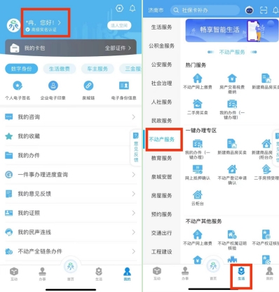 (二)掌上办理。通过手机“应用商店”或“软件商城”下载“爱山东·泉城办”手机APP,完成高级实名认证;选择“生活”模块,进入“不动产服务”,选择需要办理的事项进行办理。