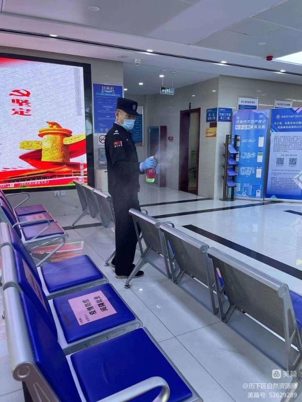 三是做好公共场所防控措施。对进入大厅办事人员严格执行48小时核酸证明、行程码、扫码量体温。安排专人严格做好消杀工作,每天对大厅、便民椅、卫生间等各个公共卫生区域进行人工喷洒消杀,确保消毒无死角。安排保洁人员对楼梯、办公桌面、各类自助服务设备和便民设施等人员接触较多的部位随时进行酒精擦拭。