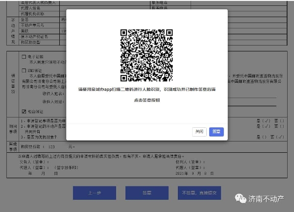 确认信息后,系统生成“不动产登记申请表”,可选择在线签章,无需到不动产登记大厅,全程在线办理;如选择“不签章,直接提交”需要您来不动产登记大厅签章确认。