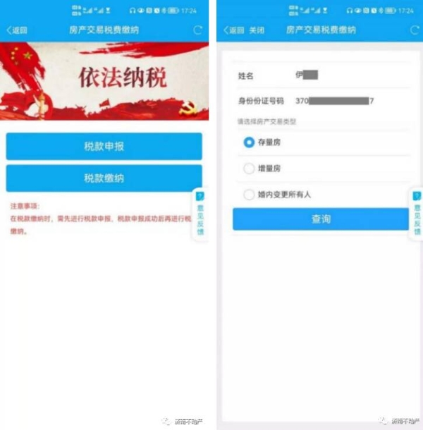 输入合同号并点击查询按钮,获取相关信息后,确认买卖双方信息、房屋信息、询问事项涉税信息(贷款买房的同时确认抵押信息)后点击“下一步”。