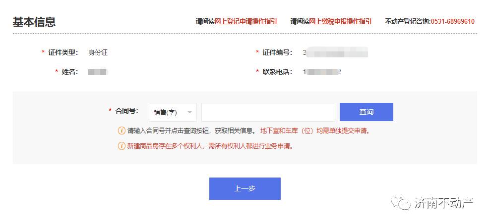 输入合同号并点击查询按钮,获取相关信息后,确认买卖双方信息、房屋信息、询问事项涉税信息(贷款买房的同时确认抵押信息)后点击“下一步”。