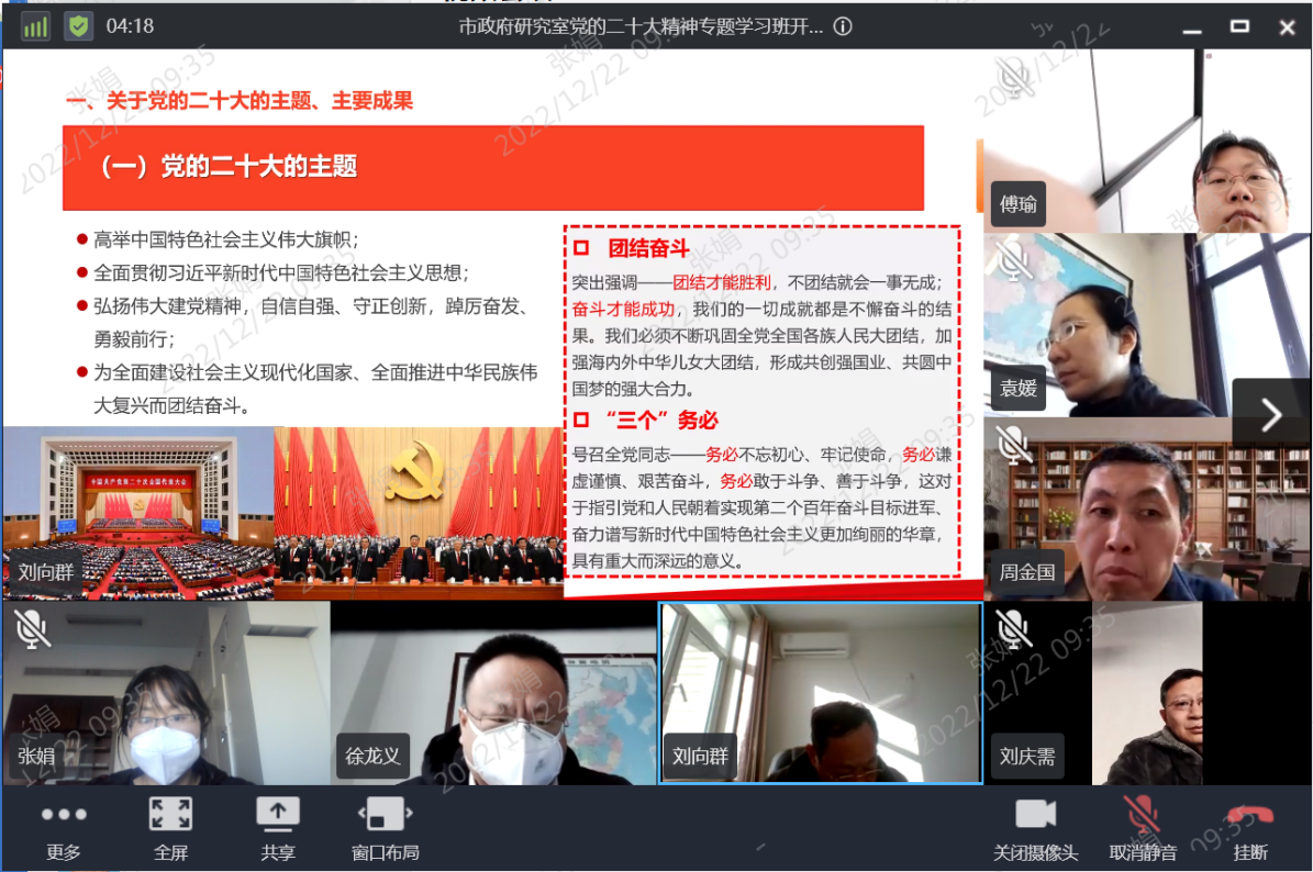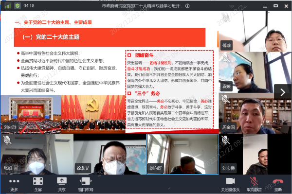 按照市委统一安排部署,12月22日上午,市政府研究室党组理论学习中心组(扩大)学习会议暨党的二十大精神宣讲报告会召开,邀请市直机关学习贯彻党的二十大精神宣讲团成员、市生态环境局党组成员、正处级领导干部刘向群作专题宣讲。会议采用山东通视频会议方式举办,市政府研究室全体党员干部参加会议。