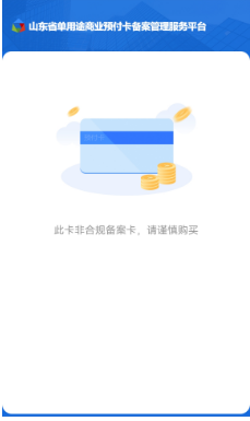 b.预付卡实体卡或虚拟卡通过扫码、点击查询链接或输入卡号查询时出现如下界面提示:“此卡非合规备案卡,请谨慎购买”字样,为非合规备案卡;查询页面如下图: