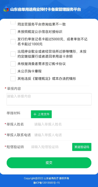 (1)登陆单用途商业预付卡备案管理服务平台后http://yfk.sdcom.gov.cn/card_web/;从网站的投诉举报或咨询服务专栏进行投诉或建议;
