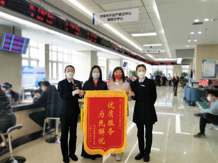 4月7日下午,远洋集团济南公司特为槐荫不动产登记分中心送来一面“优质服务,为民解忧”的锦旗,以表示对槐荫分中心主动上门、驻点服务的衷心感谢。