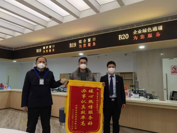 1月28日,济南金宜达家居有限公司将一面写有“暖心热情服务好,办事认真效率高”的锦旗送到了商河县自然资源局不动产登记中心工作人员手中,对县自然资源局工作人员在办理抵押登记过程中优质、便捷、高效、热情的服务表示衷心的感谢。