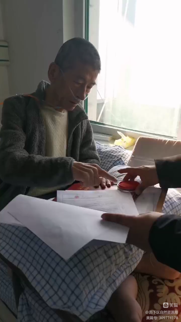 1月31日,分中心接到电话求助,由于市民姜先生已经是癌症晚期,出行困难,又有办证需求,寻求解决办法。分中心接到求助非常重视姜先生的情况,经与其家人确认,第二天为其安排了上门服务,分中心工作人员来到姜先生所在医院,在病床上为姜先生按照业务流程进行了身份核对、采集信息、签字,对其房产办理了过户登记。