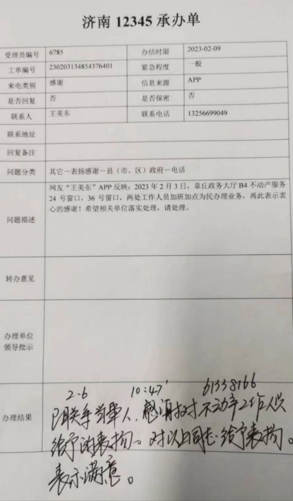 近日,网友“王美东”在我区政务网上发帖,为章丘区不动产登记中心36号受理窗口的工作人员点赞。该网友表示,当他到窗口时刚巧到了下班时间,工作人员已陆续下班,他抱着试试看的态度找到36号窗口工作人员帮忙,36号受理窗口毫不犹豫地接过材料,并延迟下班为他们办理了过户手续,同时24号税务窗口也延时服务协助其办理完成缴税业务。
