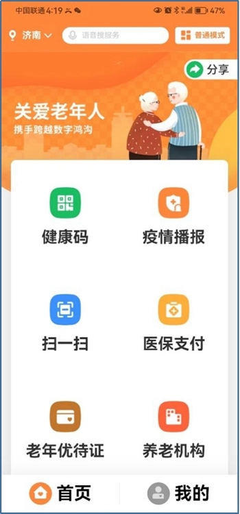 为了让老年人更好地享受数字红利,“爱山东”济南分厅上线了“老年关怀专区”,老年用户可一键切换“老年模式”。与其他服务专区相比,老年人服务专区在不影响用户体验的前提下,对视觉设计进行了整体优化,界面更加简洁清爽,采用大号字体、高对比度、极简交互方式,解决老年人阅读不便问题。为了更好满足老年群体日常办事需求,专区围绕老年群体使用服务的实际场景,将涉老服务事项集中展示,提供养老服务、医保支付和老年优待证等方便老人生活的高频服务,让老年人线上办事更简单高效。