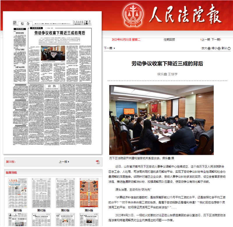 - 历下法院劳动法庭源头治理多元解纷工作在《人民法院报》刊发2023-02-03